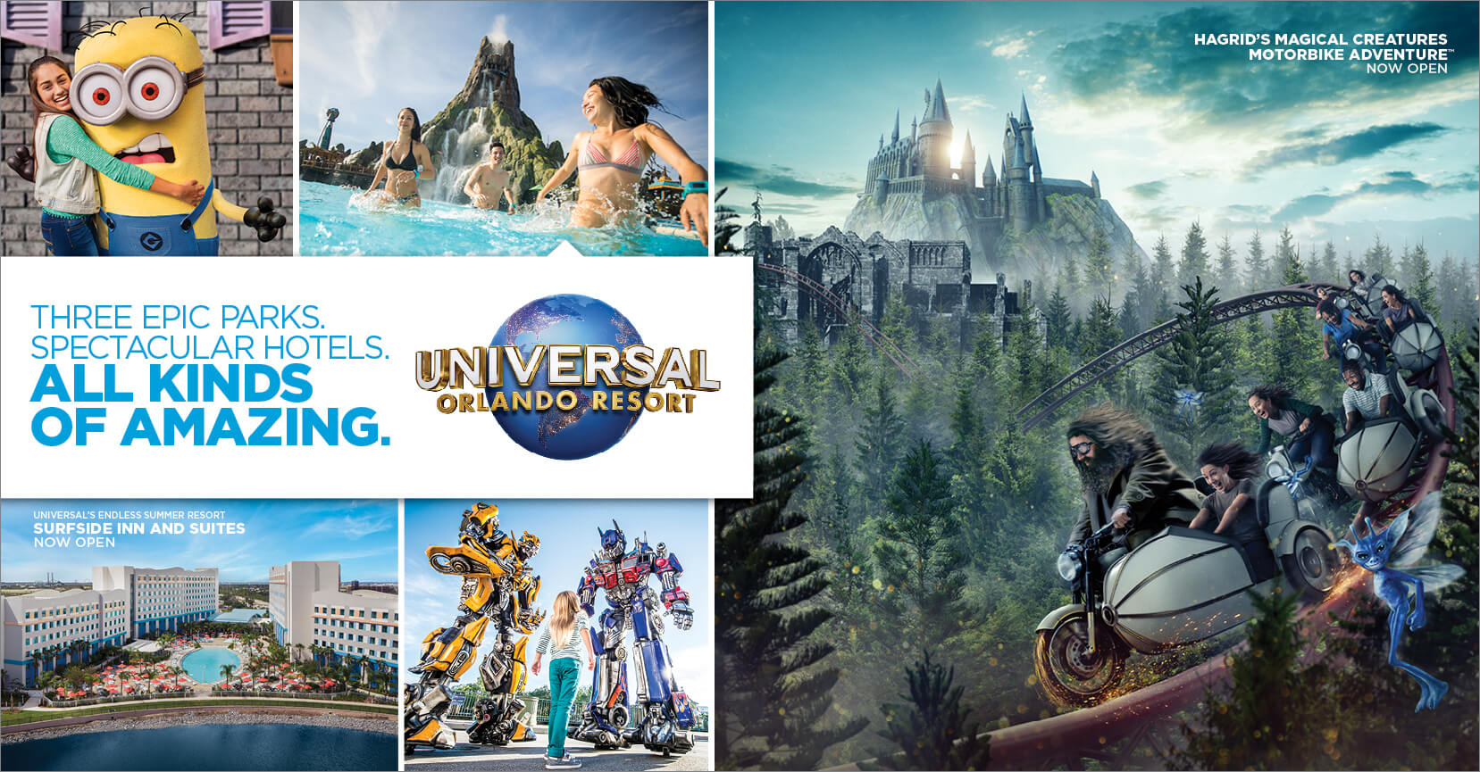 Take a vacation beyond anything you’ve experienced before at Universal Orlando Resort. Journey through legendary worlds of incredible heroes at Universal’s Islands of Adventure. Here you’ll find The Wizarding World of Harry Potter™ - Hogsmeade™, where you can ride the thrilling new roller coaster, Hagrid’s Magical Creatures Motorbike Adventure™, now open. Meet the mischievous Minions and join forces with the TRANSFORMERS as you immerse yourself in the next generation of blockbuster entertainment at Universal Studios Florida. Enjoy the thrills and relaxation of a tropical paradise like no other at Universal’s Volcano Bay water theme park. From theme park excitement, to spectacular hotels in the center of it all, each offering a range of exclusive theme park benefits, to the dining and entertainment of Universal CityWalk, Universal Orlando Resort is a vacation of endless awesome.